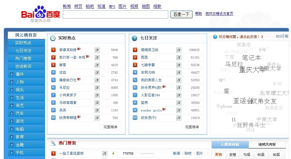 8月23日晚百度搜索風云榜新版正式上線,強大的產(chǎn)品功能和便捷的信息服務,為4億網(wǎng)民帶來了一次用戶體驗的完美升級!新版風云榜以百度每天數(shù)億次搜索為基礎,從用戶需求出發(fā),突出了開放、實時、全方位及整合四個新特點,目的是將百度風云榜打造成為最權(quán)威的中文搜索風云榜。